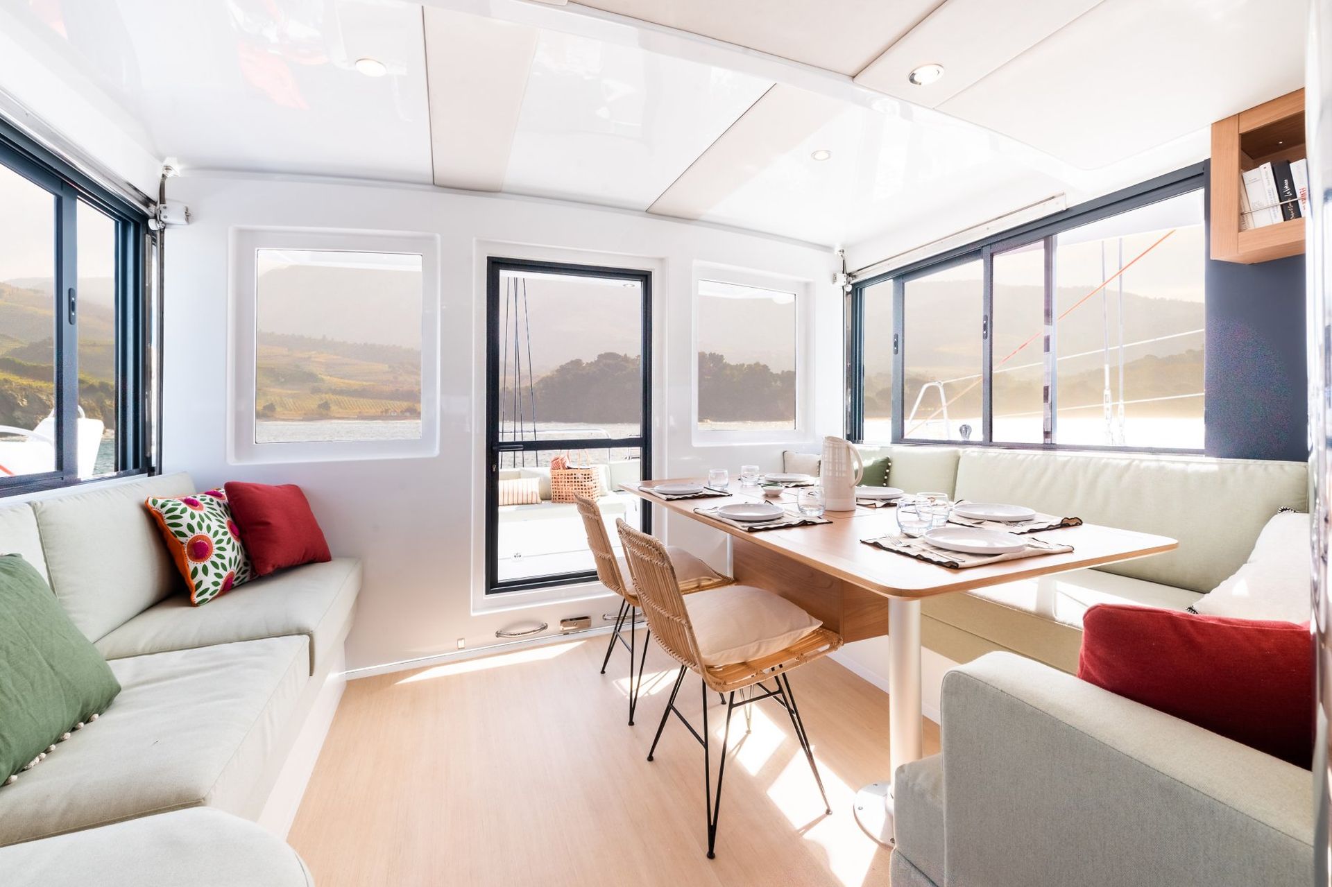 INNOVACIÓN: El nuevo Bali Catsmart sintetiza todas las últimas novedades de la gama: la bañera rígida de proa con zona lounge y solarium, con una amplia banqueta y cofres, los dos puestos de mando muy cómodos que centralizan todas las maniobras, el sistema de pescante sencillo y muy práctico, sin olvidar la gran puerta basculante Bali y las ventanillas laterales correderas que, una vez abiertas, ofrecen una zona de cocina/salón/bañera sin precedentes en un catamarán de estas dimensiones.